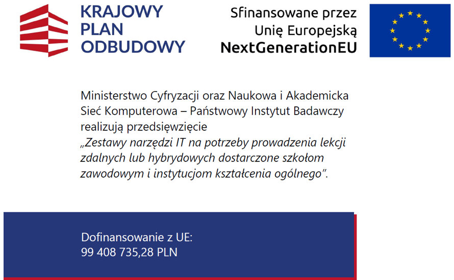 W ramach funduszy z Krajowego Planu Odbudowy i Zwiększenia Odporności (KPO) szkoły w Polsce będą wyposażane w nowoczesny sprzęt tj. narzędzia informatyczne na potrzeby prowadzenia lekcji zdalnych lub hybrydowych w ramach realizacji wskaźnika C12L.