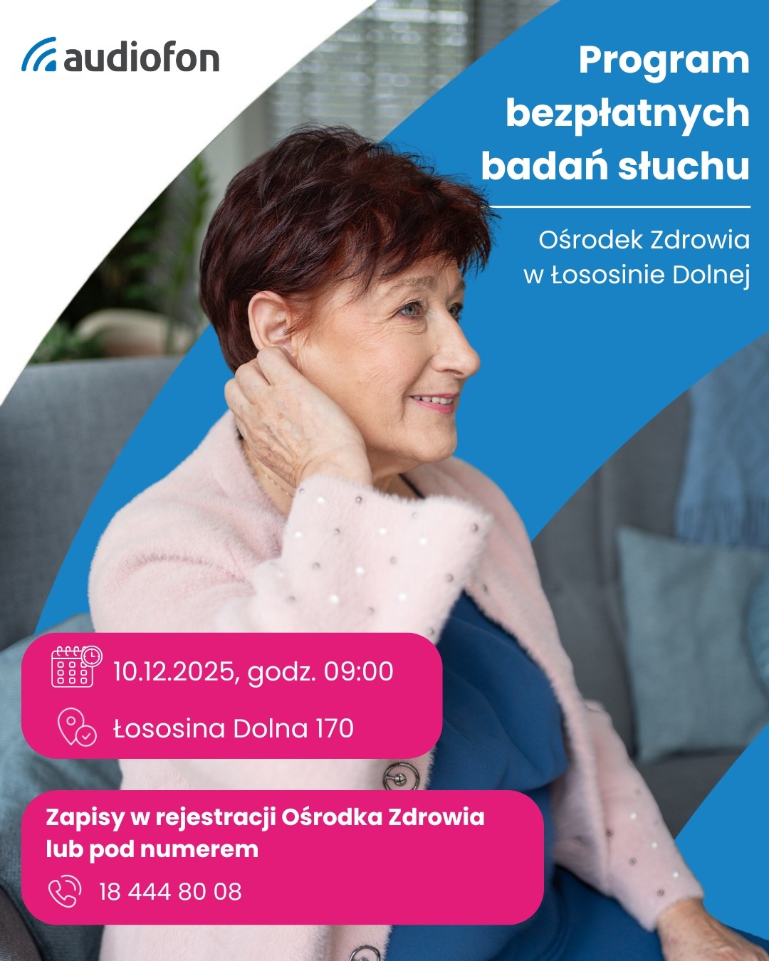 Bezpłatne badania słuchu! Masz ukończone 60 lat? Zadbaj o swój słuch! Zapraszamy na bezpłatne badania słuchu w Ośrodku Zdrowia w Łososinie Dolnej. Zadbaj o zdrowie – to tylko chwila, a może zmienić wiele!