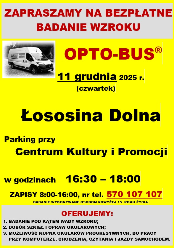 Zapraszamy na bezpłatne badanie wzroku. Data: 11 grudnia 2025r (czwartek); Gdzie: Parking przy Centrum Kultury i Promocji Gminy Łososina Dolna; godz. 16.30-18.00; Zapisy:tel.: 570 107 107.