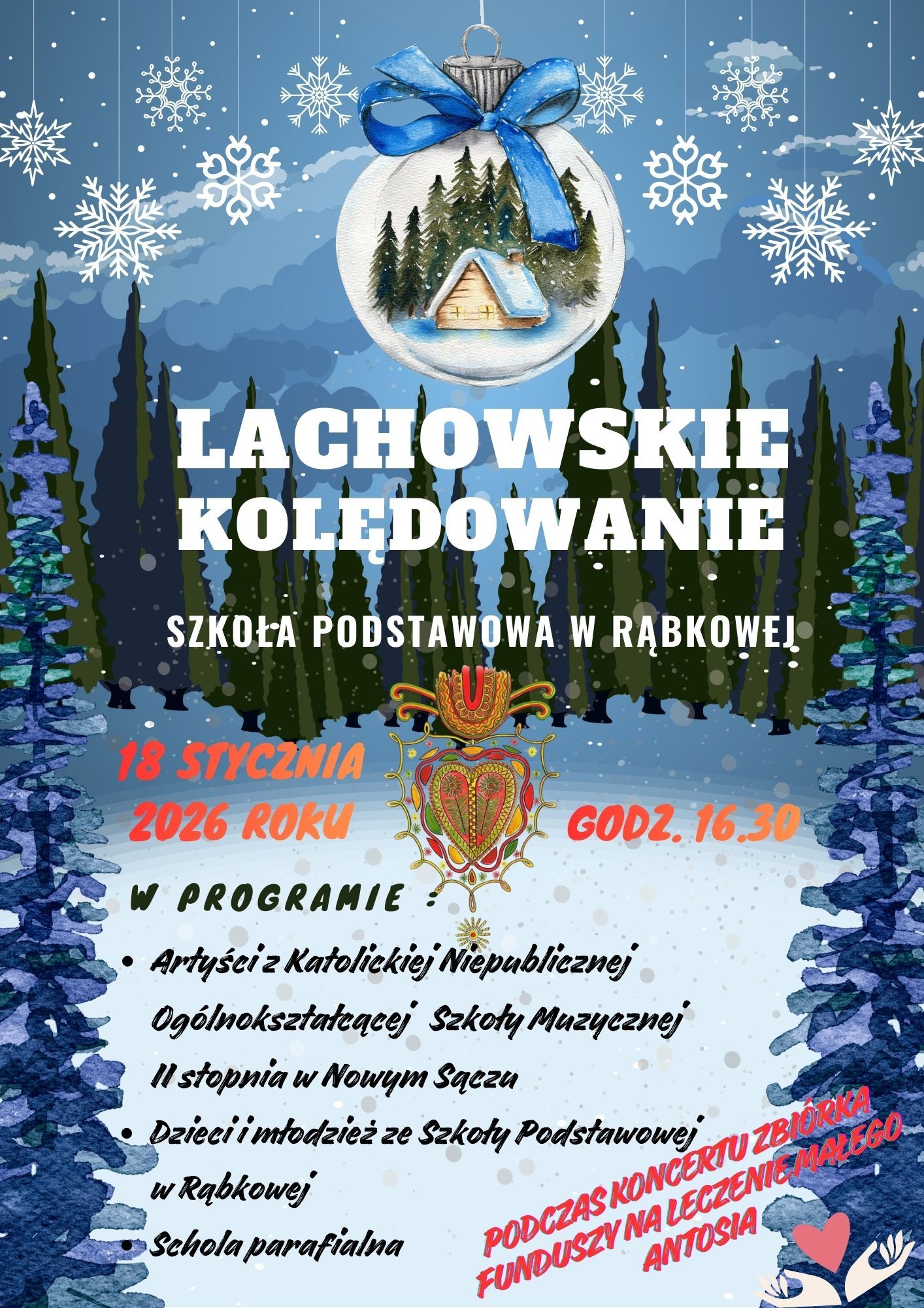Zapraszamy Mieszkańców i Gości Gminy Łososina Dolna na "Lachowskie Kolędowanie", które odbędzie się 18 stycznia 2026 roku (niedziela) o godz. 16:30 w Szkole Podstawowej w Rąbkowej.