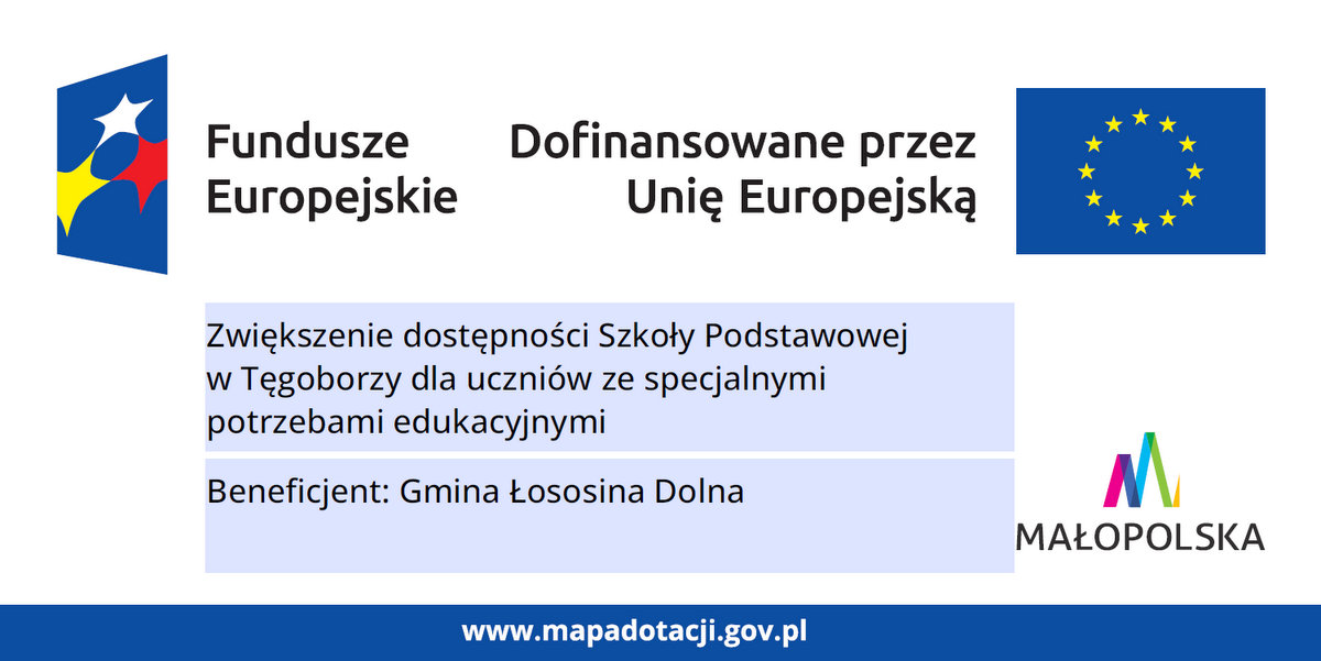 Gmina Łososina Dolna realizuje projekt pn.: „Zwiększenie dostępności Szkoły Podstawowej w Tęgoborzy dla uczniów ze specjalnymi potrzebami edukacyjnymi” w ramach programu Fundusze Europejskie dla Małopolski 2021-2027, Priorytet 5. Fundusze europejskie wspierające infrastrukturę społeczną, Działanie 5.1 Infrastruktura szkół podstawowych i ponadpodstawowych prowadzących kształcenie ogólne, Typ A. zwiększenie dostępności szkół podstawowych i ponadpodstawowych prowadzących kształcenie ogólne dla osób ze specjalnymi potrzebami edukacyjnymi.